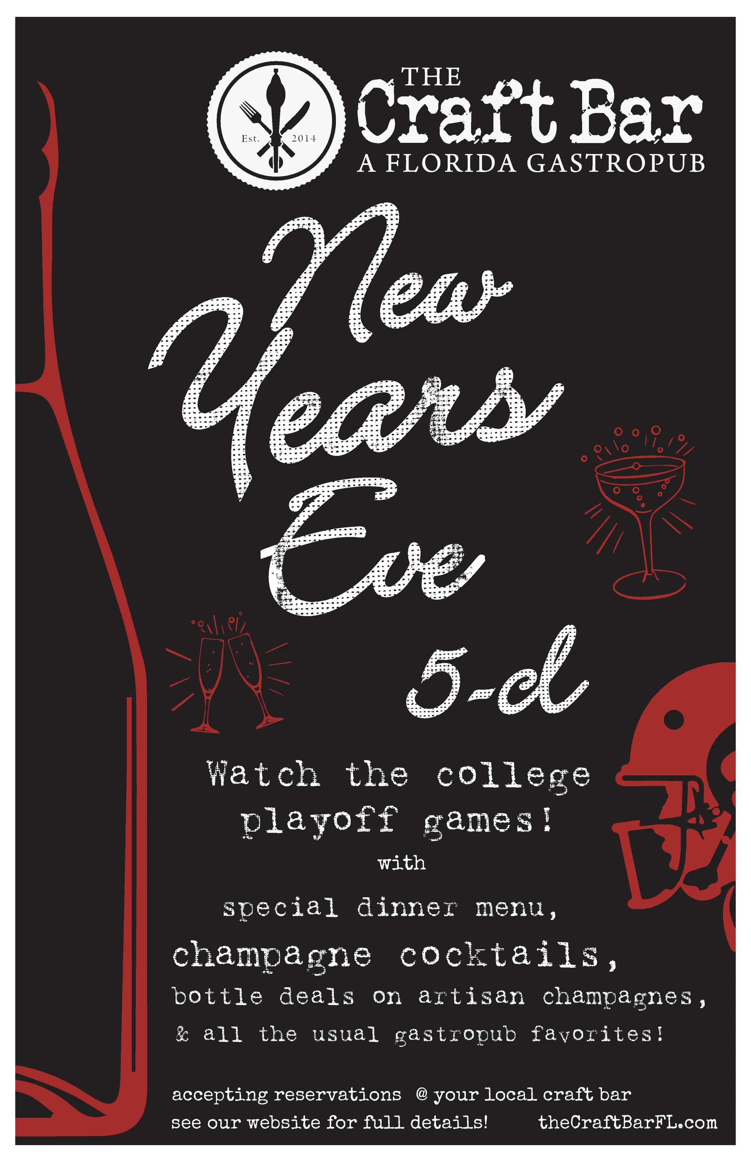 Football fans don't despair! Join us as we celebrate New Year's Eve with a gourmet meal, bottle deals on Champagne, Champagne cocktails, and of course - all the craft beer and usual gastropub favorites.