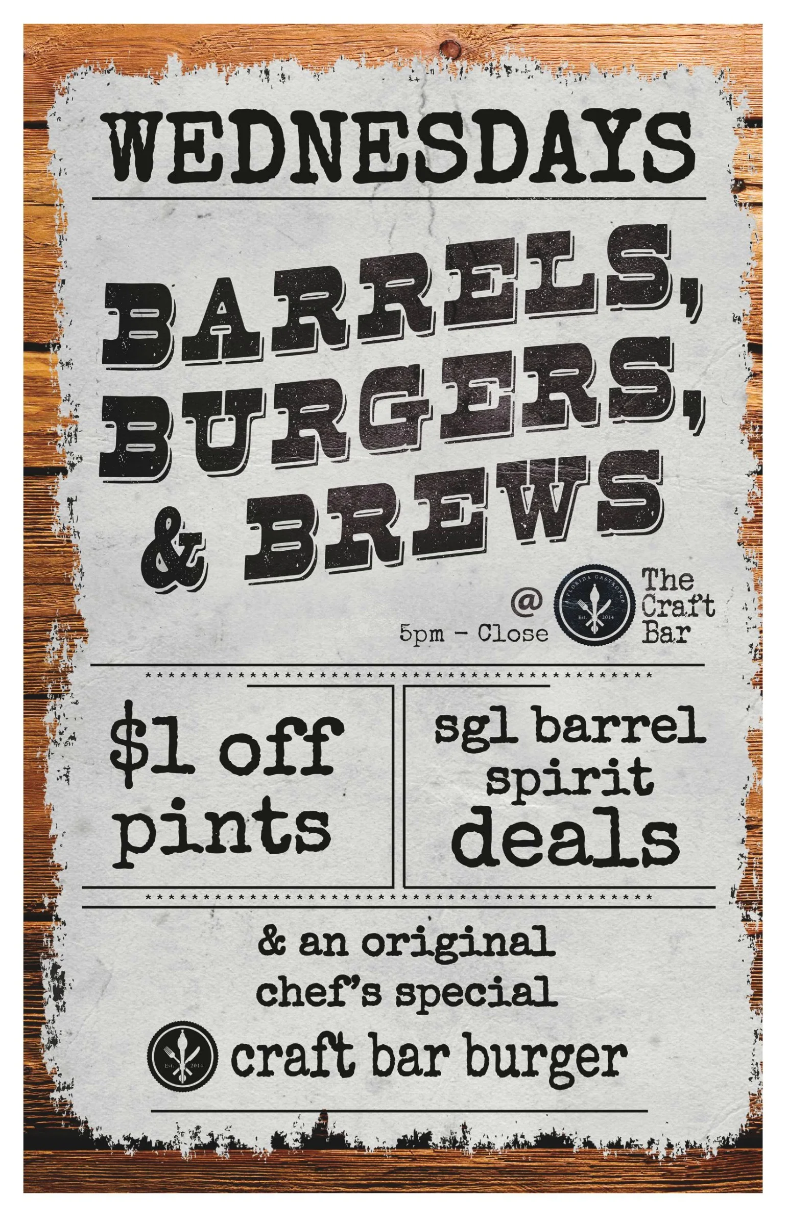 Each Wednesday enjoy some of the best that The Craft Bar has to offer! Our exclusive single barrelspirits are available at a special price - you won't find these anywhere else!